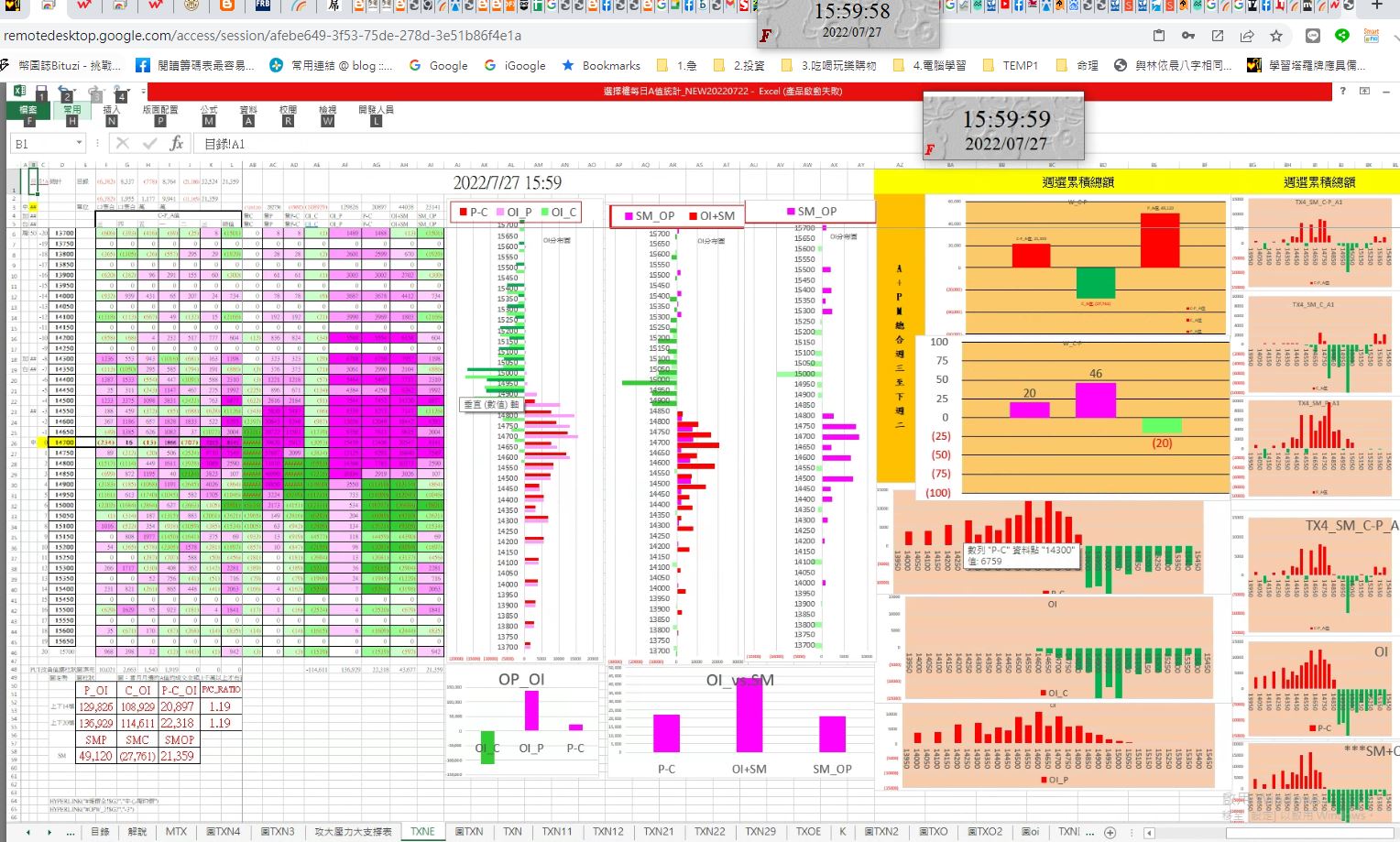 20220722五07:071.美股韓國台股近期每天墊高一直漲未破前一天低點或五日均都不用偏空2.下週三週選上看C巨量15000~15200,下看P巨量14400~143003.下週三及四有週選及摩台及蘋果財報一堆變數開始